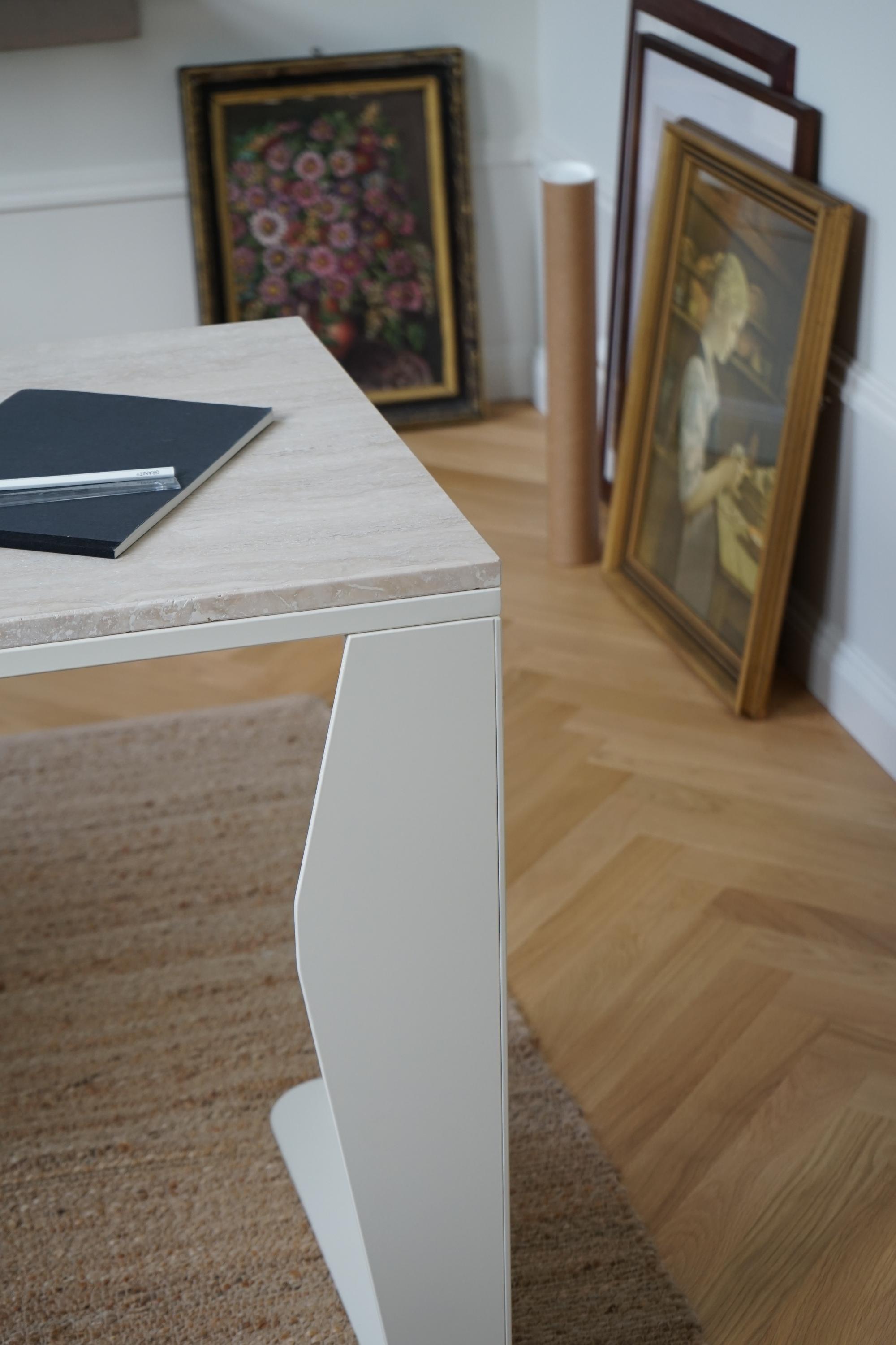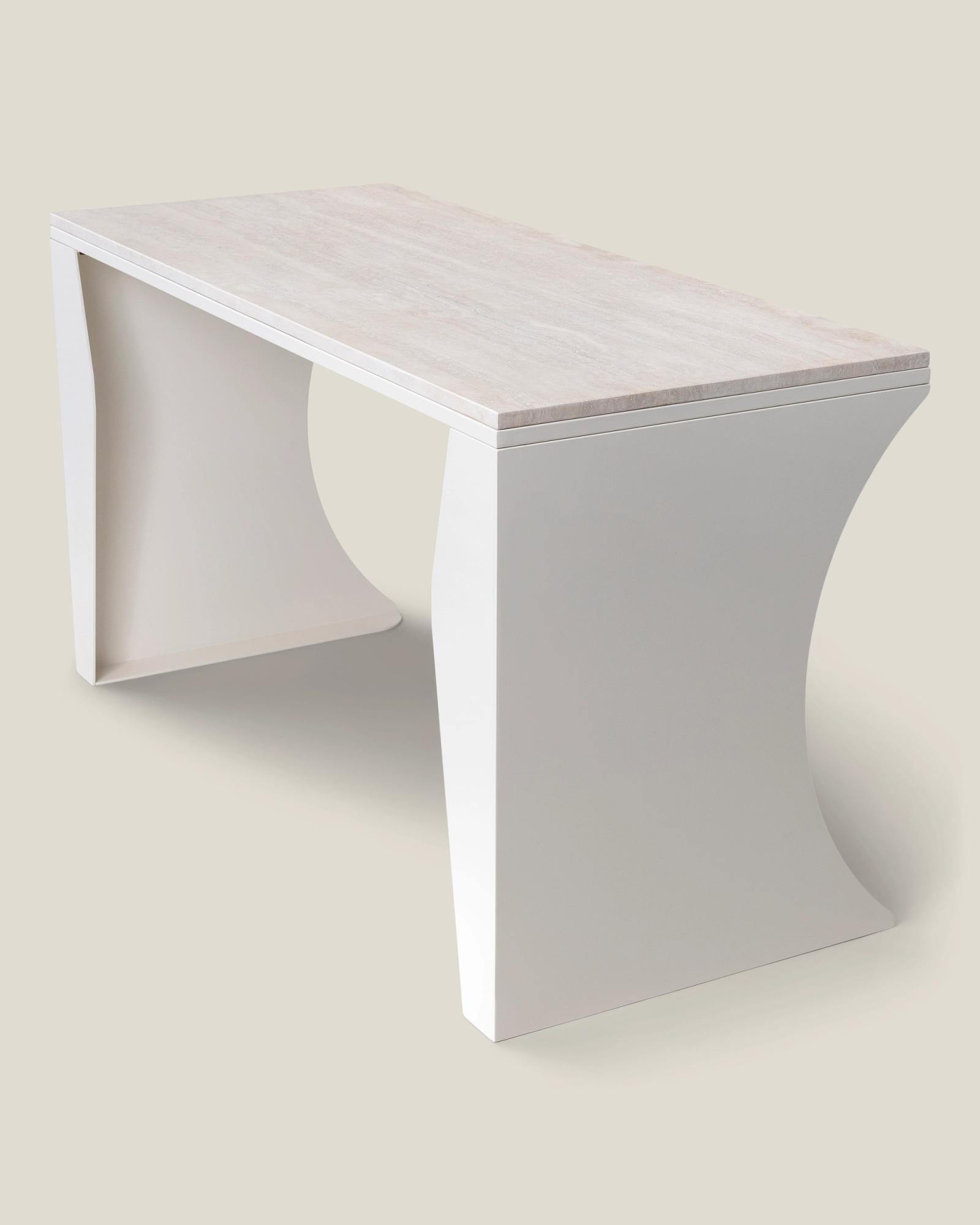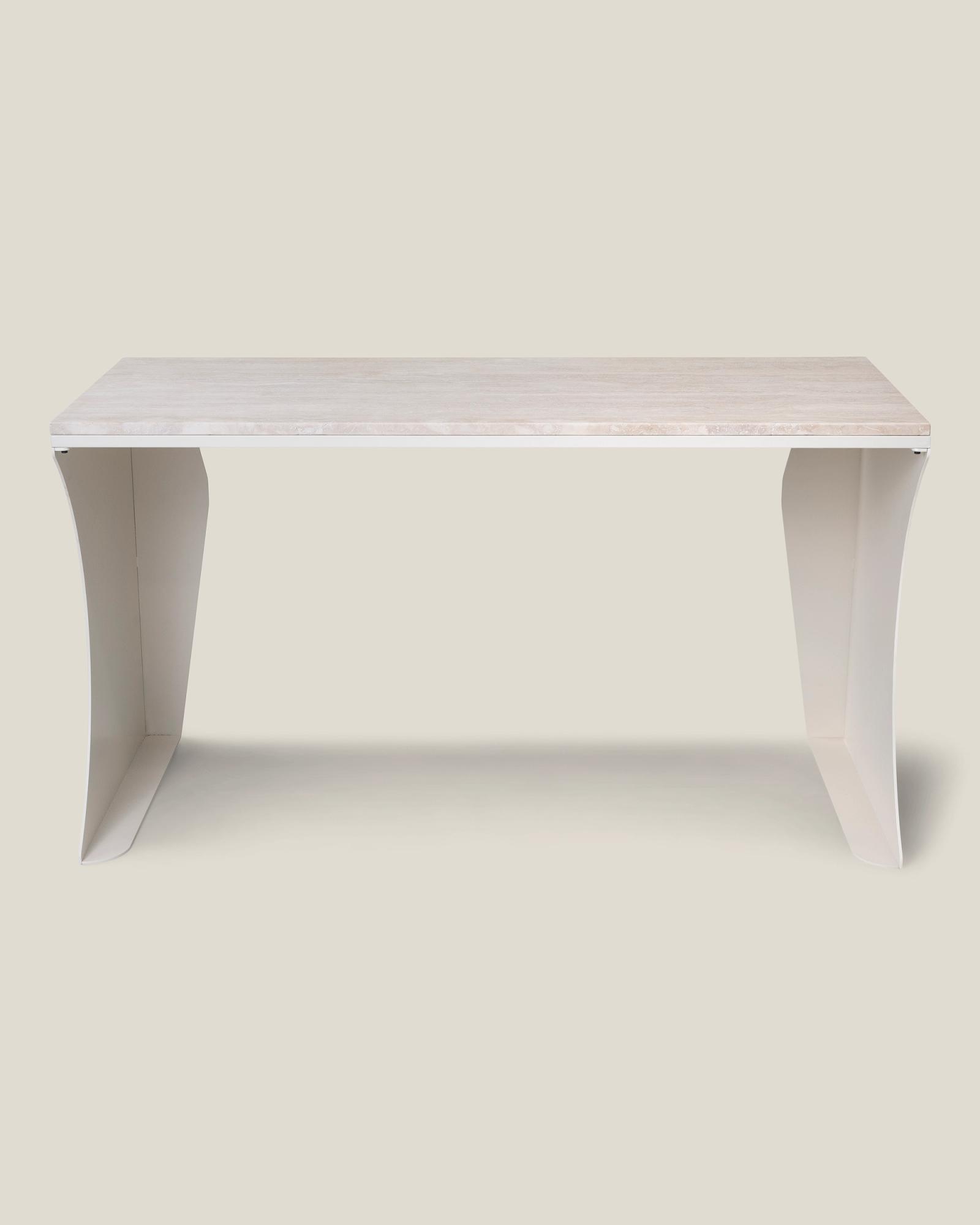 A desk made for the flow of productivity, where days meld into one another as you pursue your distant goal. A crescent moon-shaped frame in laser-cut steel, accompanied by a polished Italian travertine surface – this desk is crafted for the inspiration that comes with those late-night endeavours, stretching into the early rays of dawn.