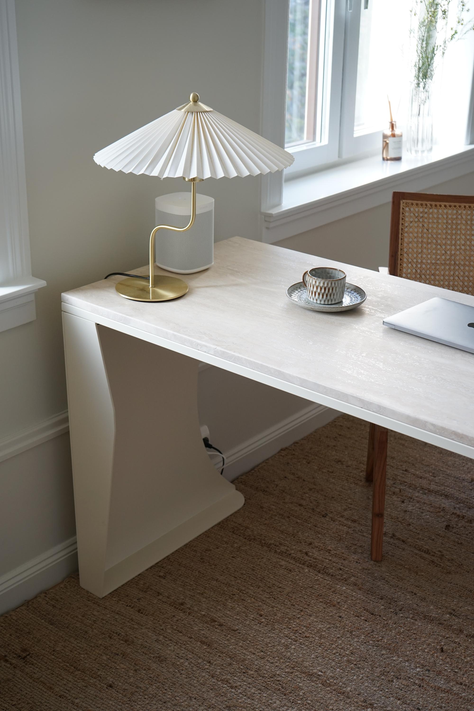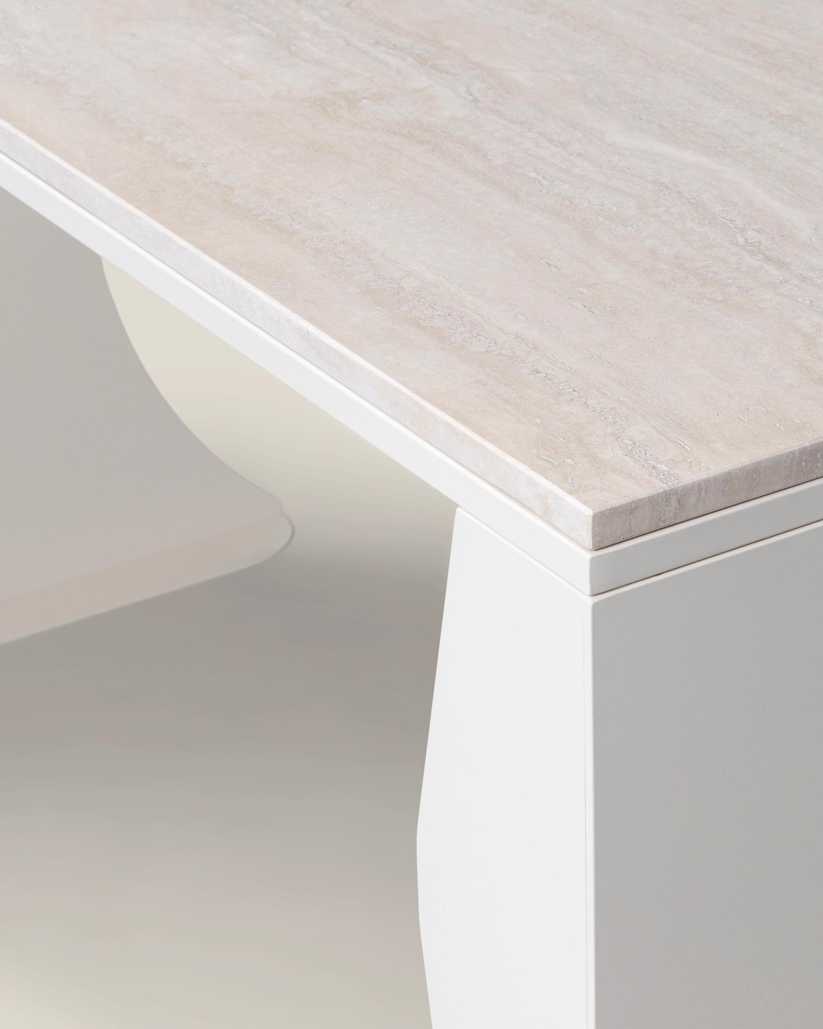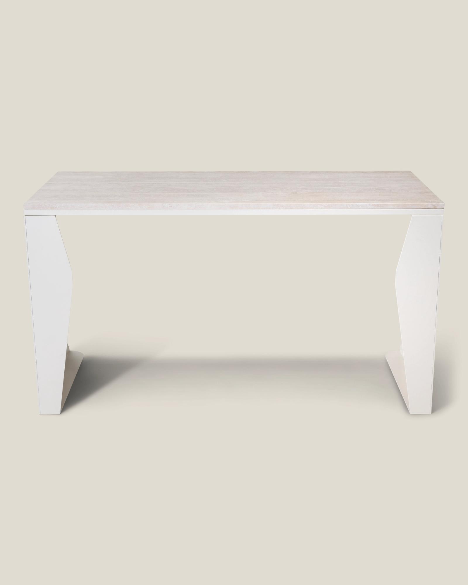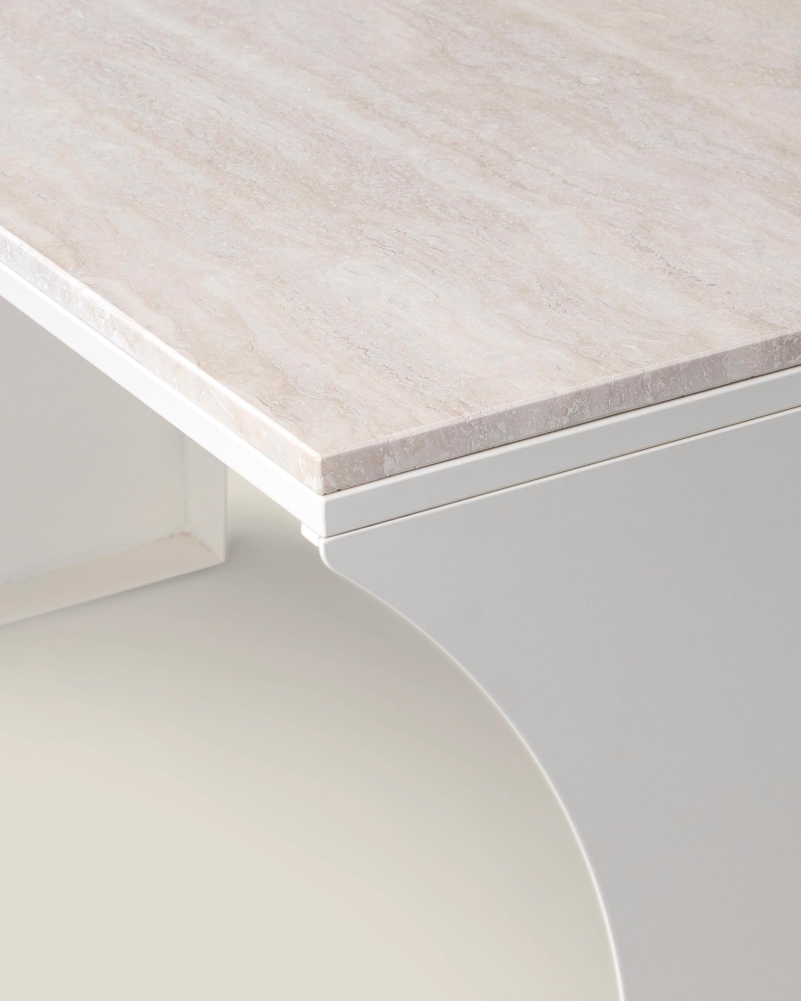 A desk made for the flow of productivity, where days meld into one another as you pursue your distant goal. A crescent moon-shaped frame in laser-cut steel, accompanied by a polished Italian travertine surface – this desk is crafted for the inspiration that comes with those late-night endeavours, stretching into the early rays of dawn.
