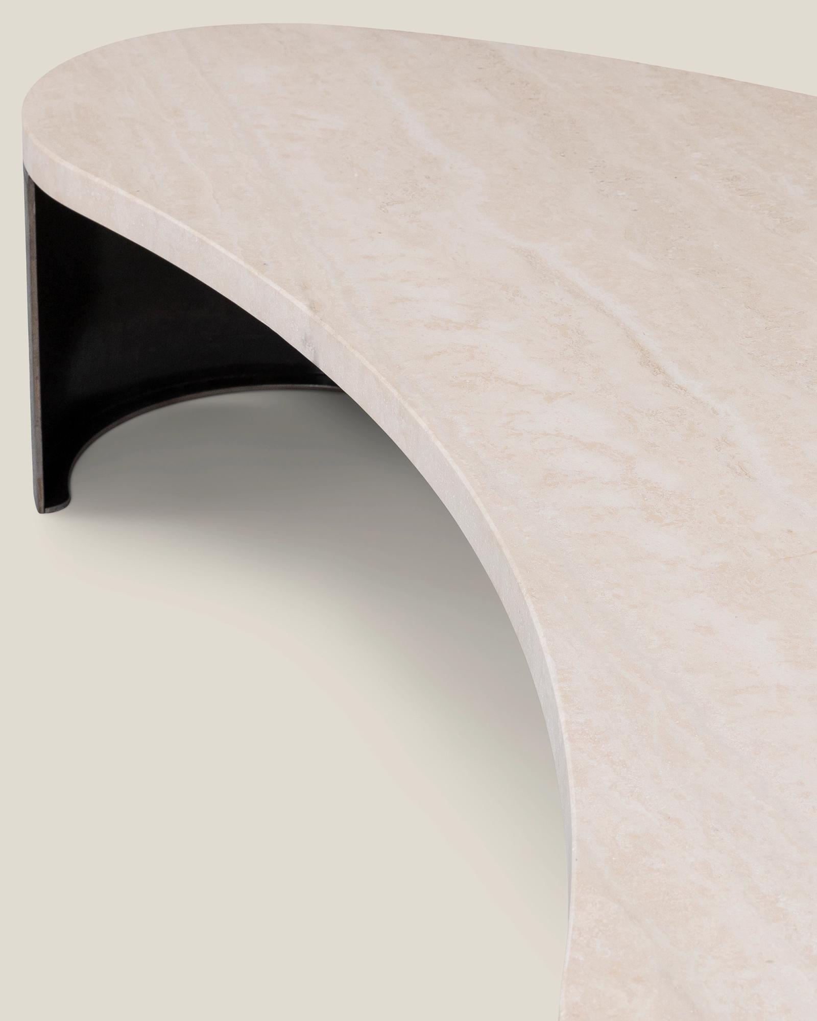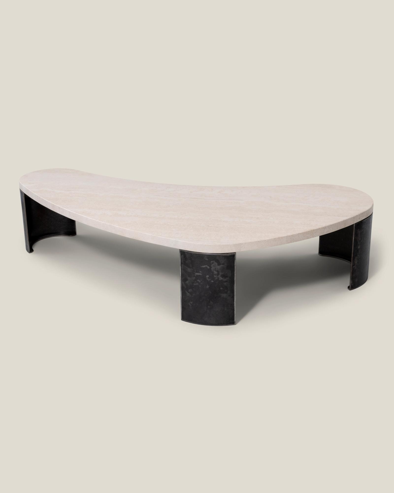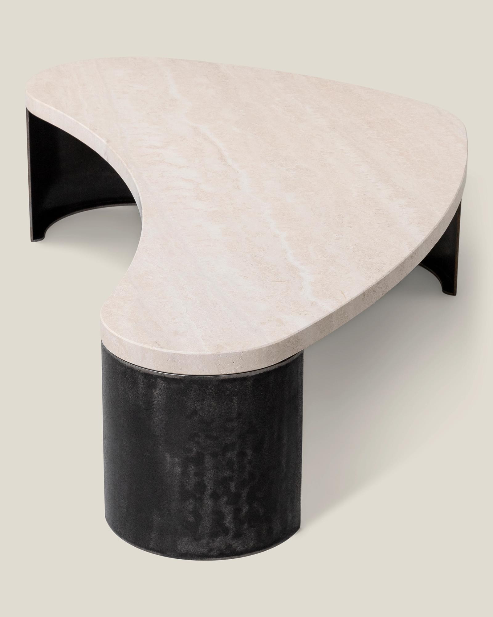 This coffee table bears the imprint of three dedications: creativity, utility, and beauty. Crafted with Italian travertine, supported by raw steel, and inspired by traditional rural aesthetics, this organically shaped table serves as a focal point in any living space. A sophisticated and functional heirloom meant to last a lifetime