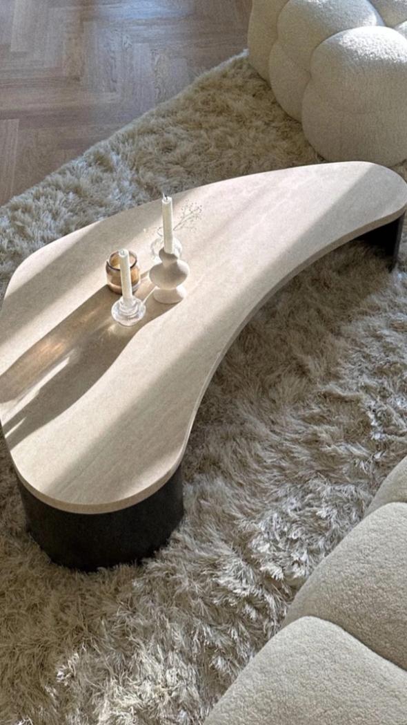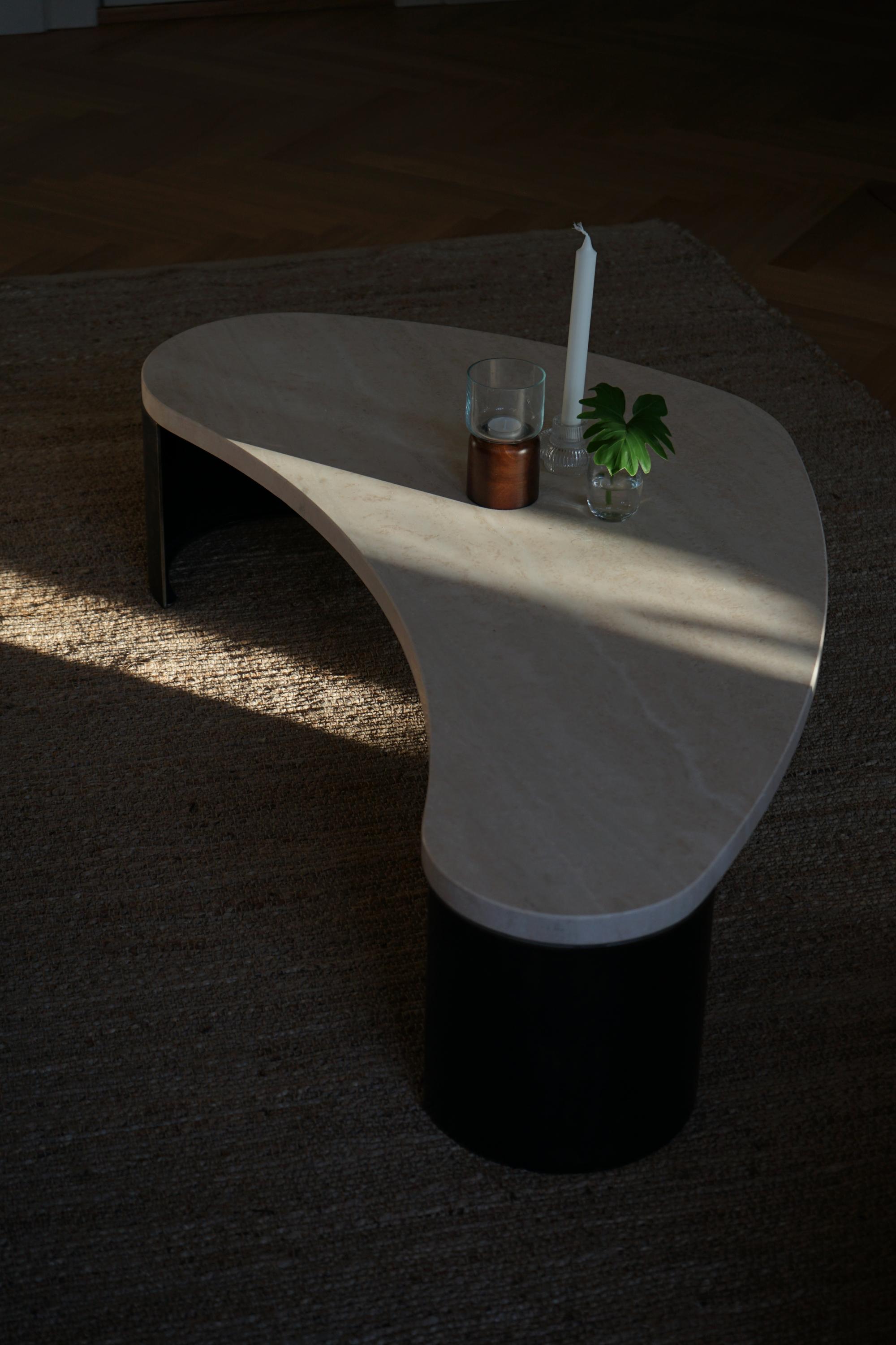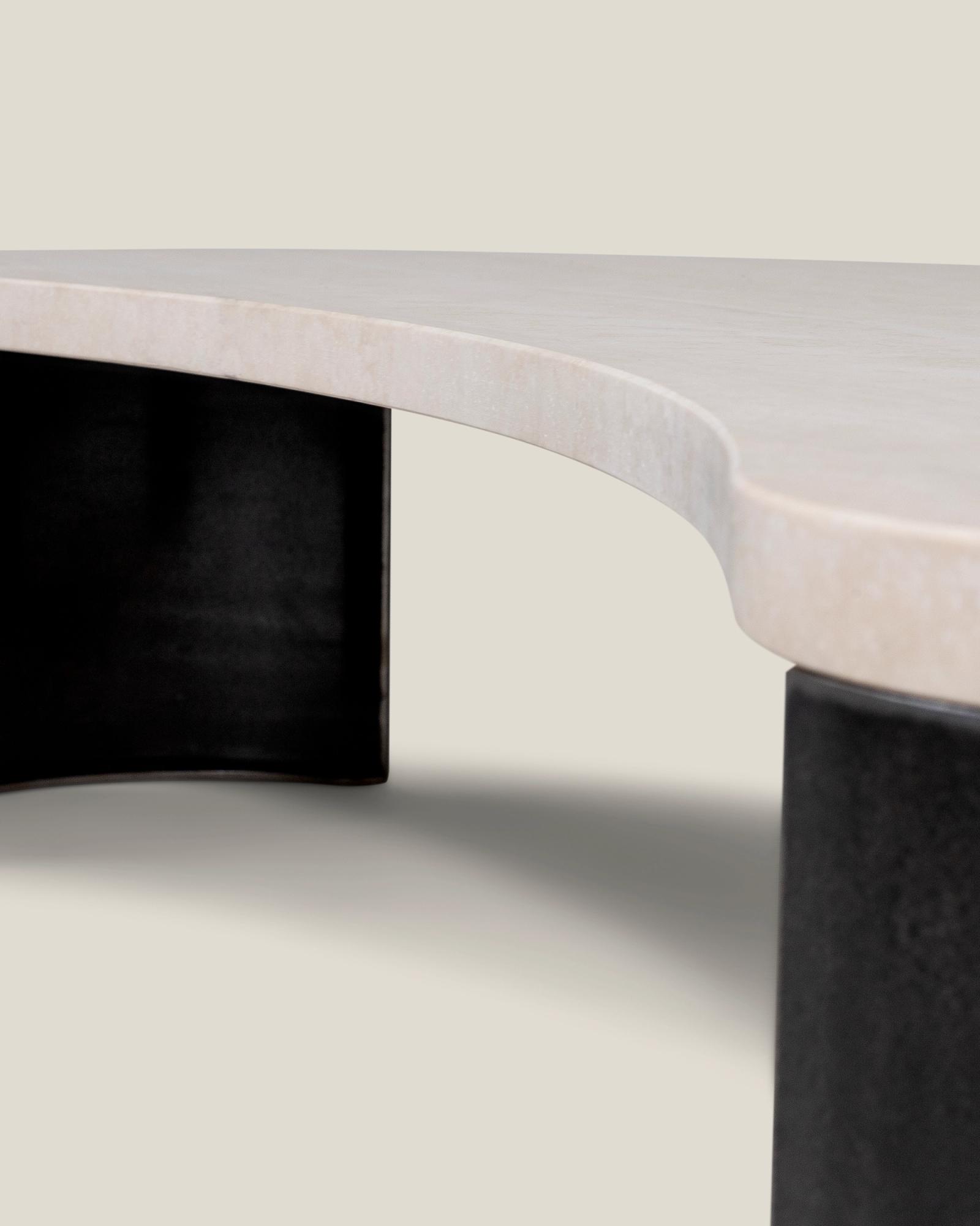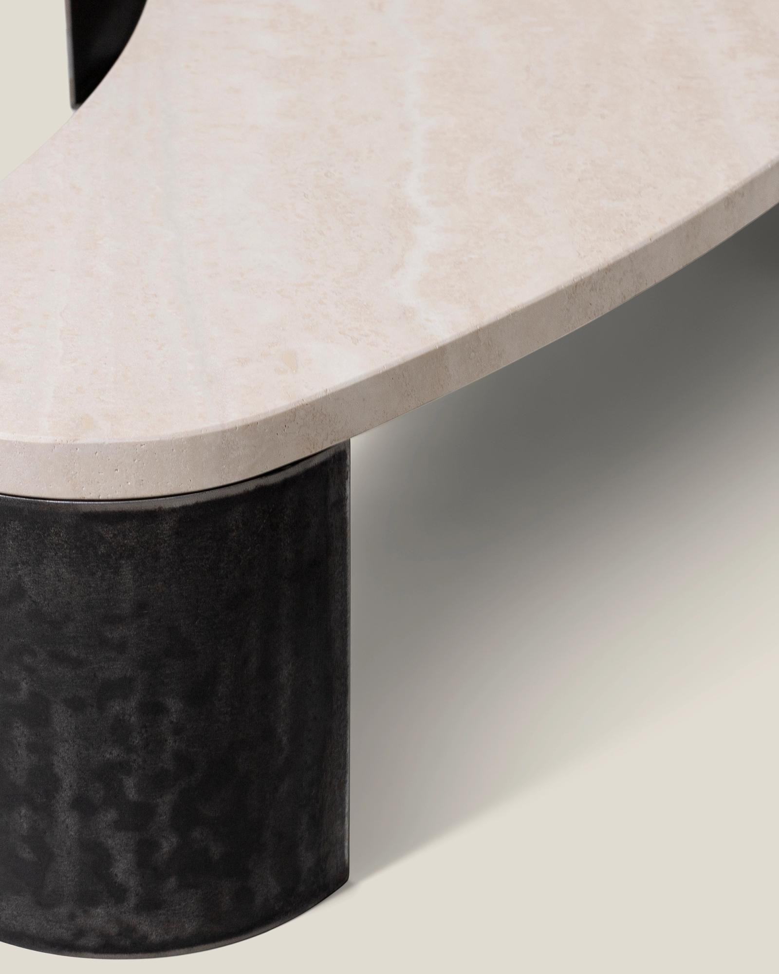This coffee table bears the imprint of three dedications: creativity, utility, and beauty. Crafted with Italian travertine, supported by raw steel, and inspired by traditional rural aesthetics, this organically shaped table serves as a focal point in any living space. A sophisticated and functional heirloom meant to last a lifetime