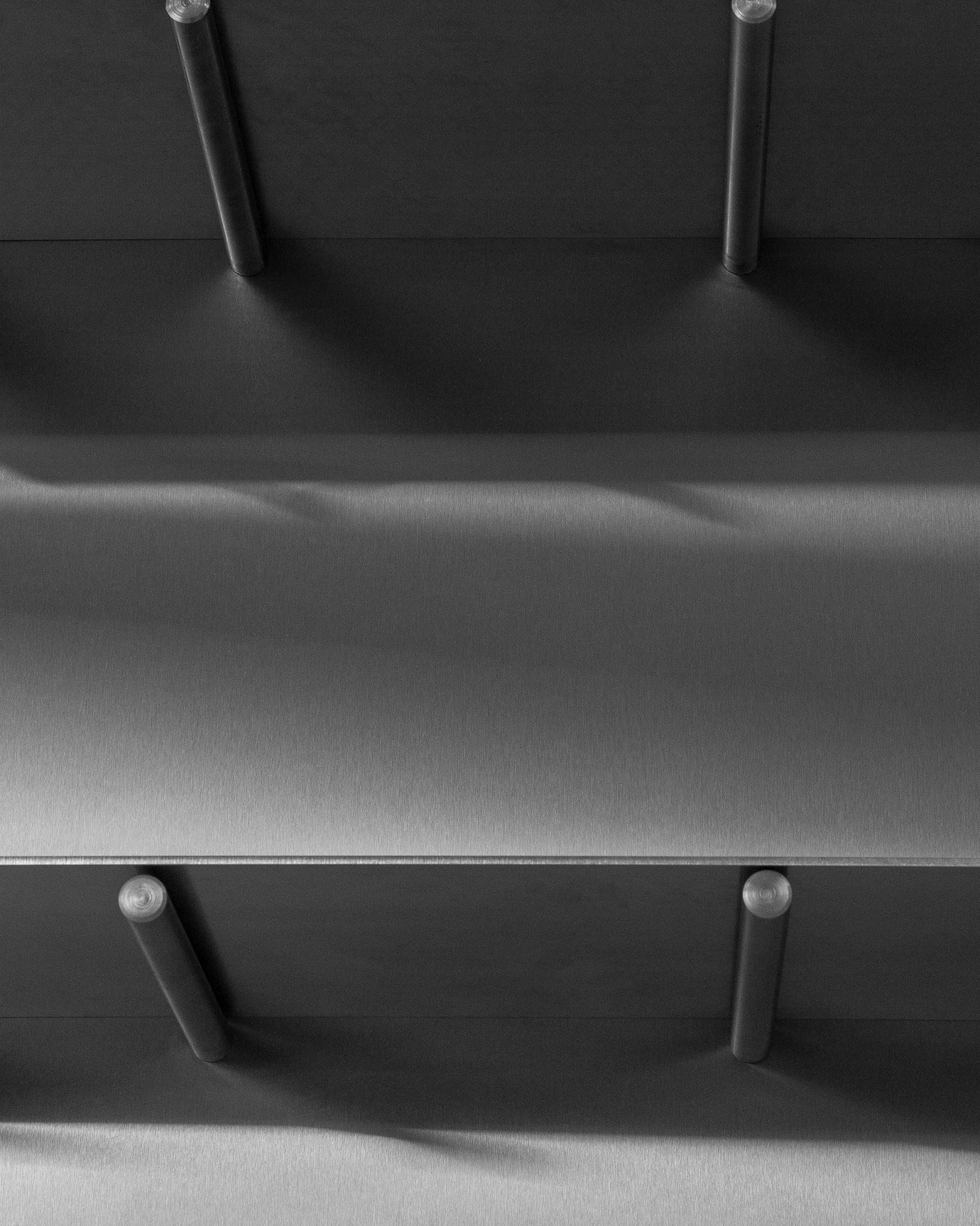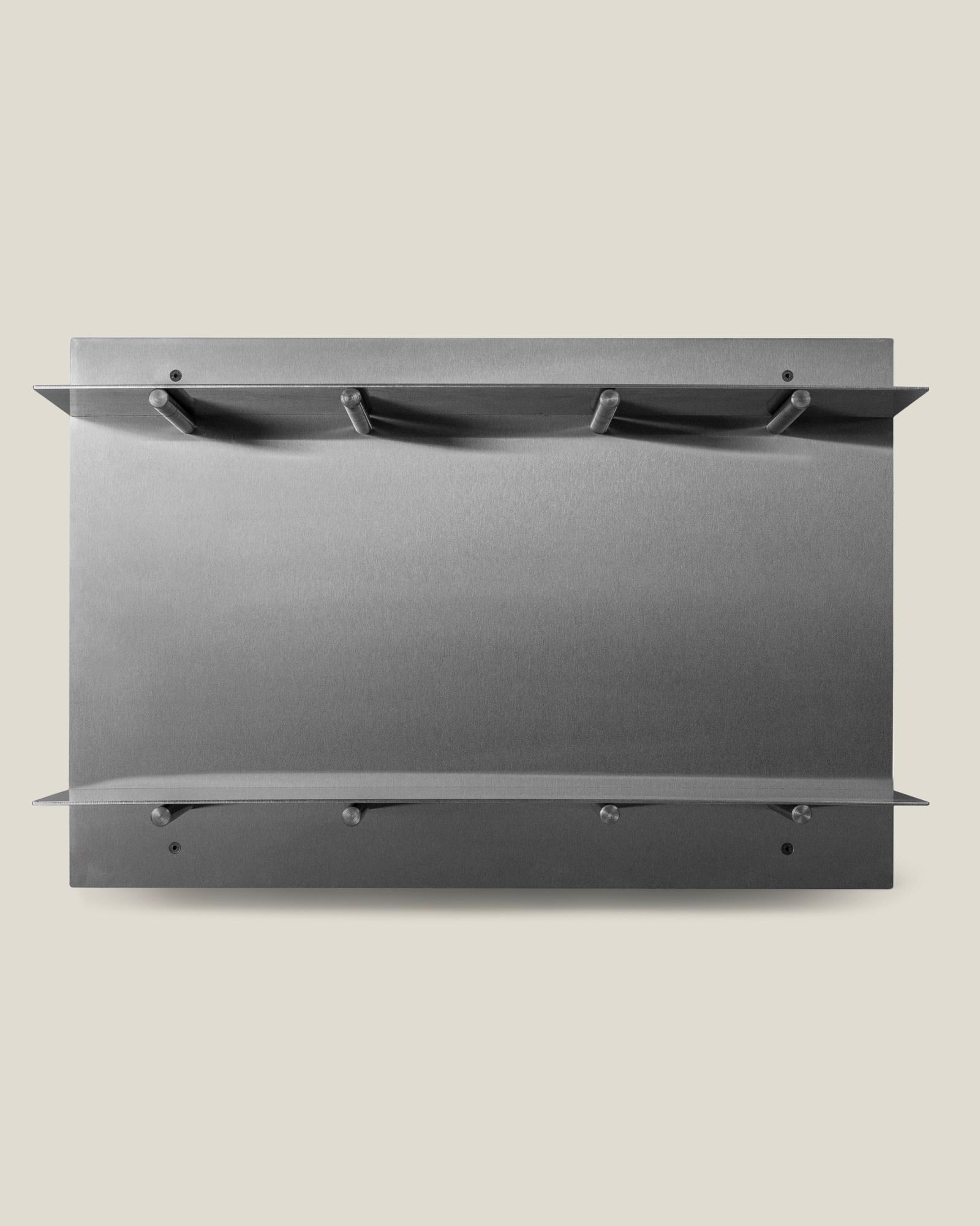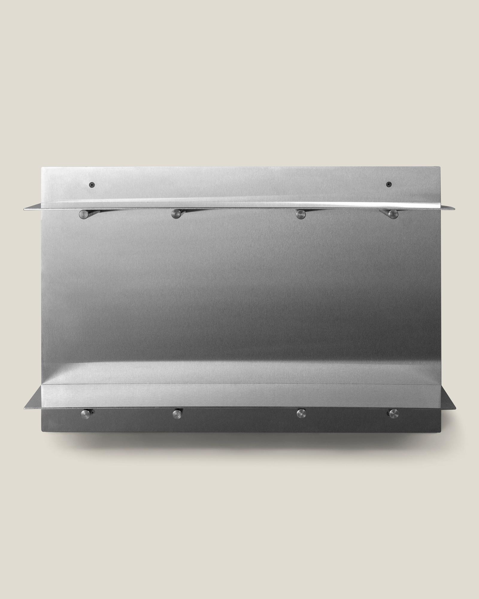A raw and elegant shelf crafted to stand the test of time while blending itself into any space, creating a minimal backdrop for your goods and keepsakes. The raw stainless steel sheet is divided by two different levels with solid steel bolts, creating a dynamic shelf that can easily be placed and restyled in a variety of ways