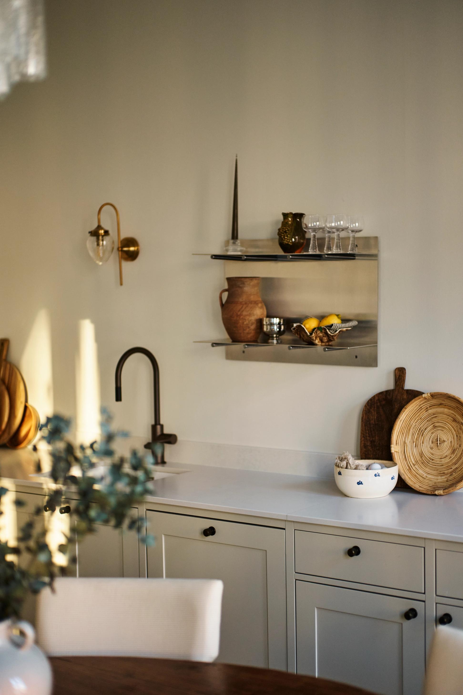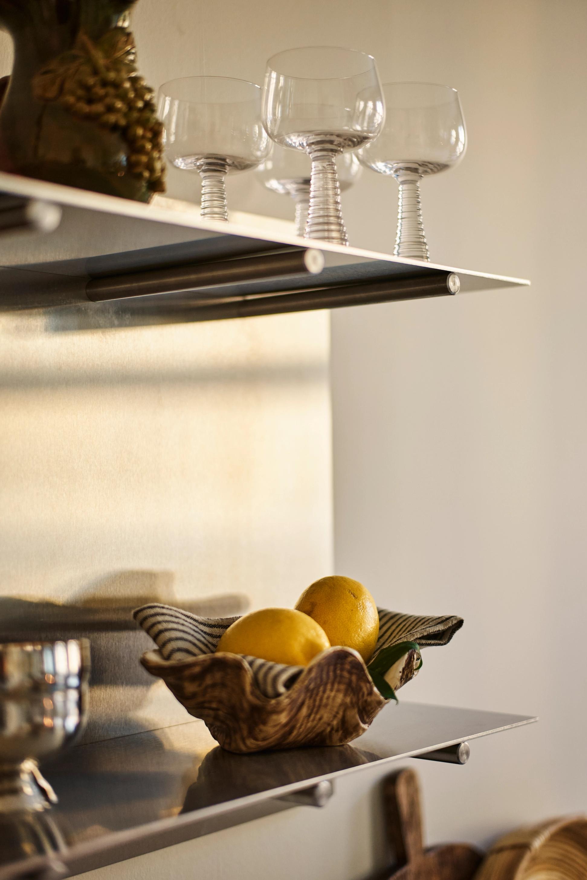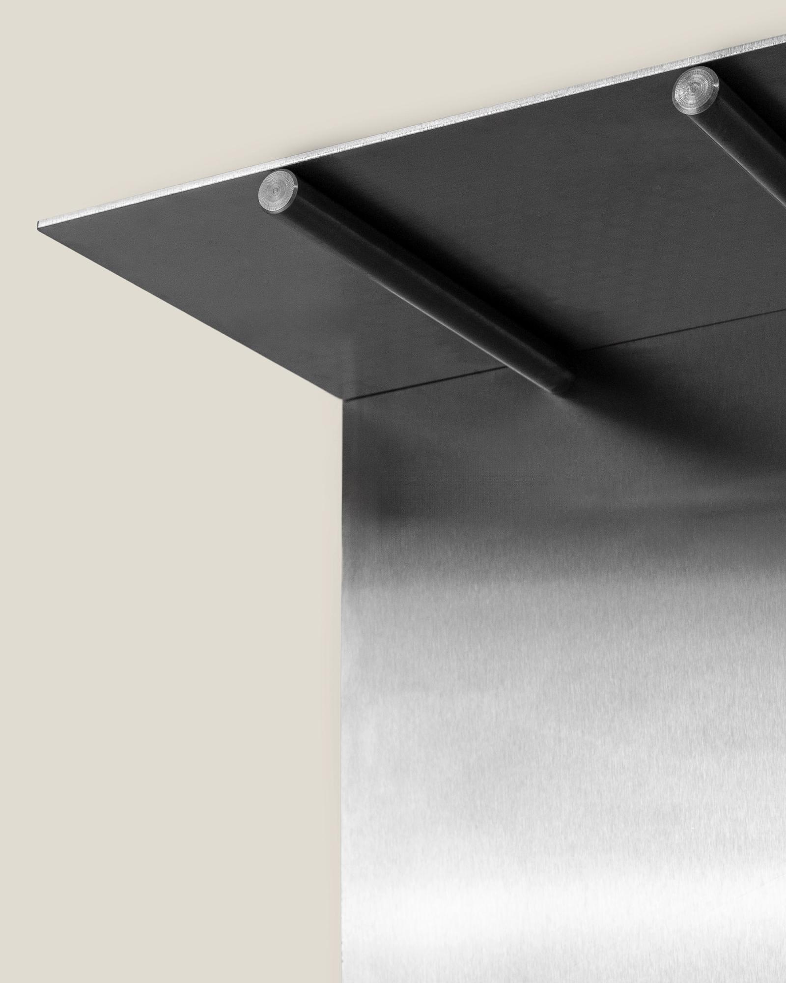 A raw and elegant shelf crafted to stand the test of time while blending itself into any space, creating a minimal backdrop for your goods and keepsakes. The raw stainless steel sheet is divided by two different levels with solid steel bolts, creating a dynamic shelf that can easily be placed and restyled in a variety of ways