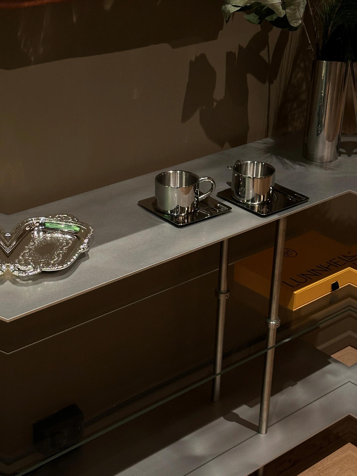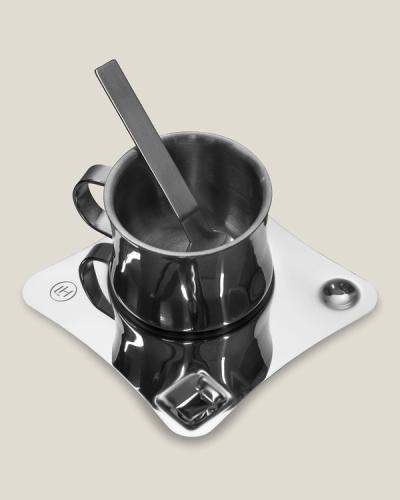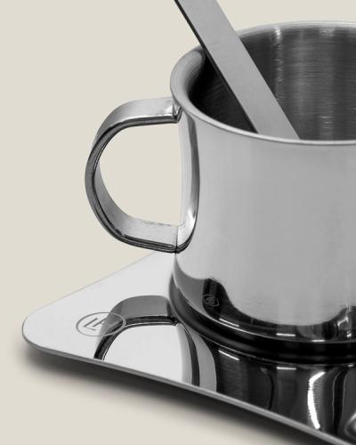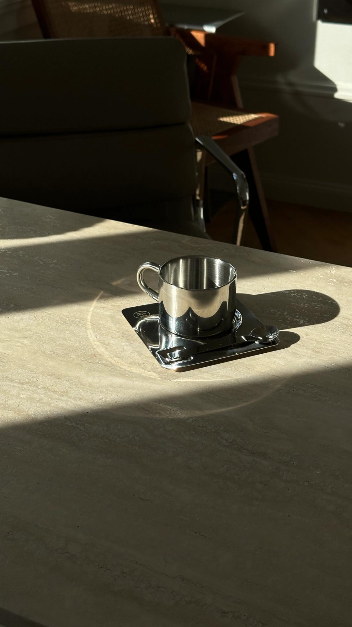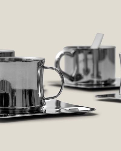An espresso set made from polished stainless steel. Durable, heat-retaining, and designed for everyday use. Clean forms, balanced weight, and a precise feel in the hand.