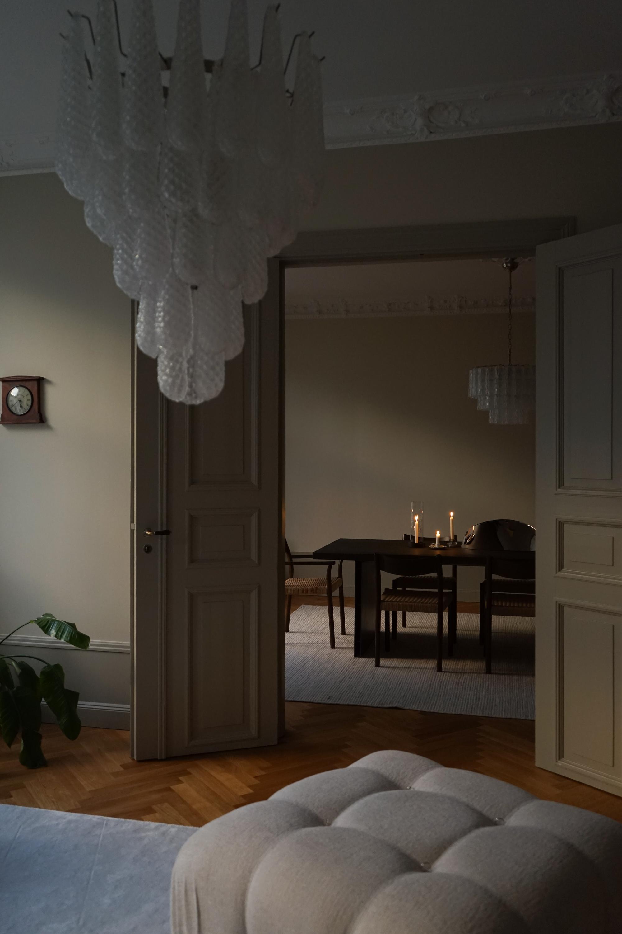 Stor og vakker, autentisk Murano lysekrone med 52 dråpeformede glass. Den bruker syv lyspærer med E14 sokkel, og med riktige lyspærer avgir den et helt fantastisk fint og stemningsfullt lys. Vi kommer gjerne med anbefalinger til lyspærer, og etter avtale kan vi også levere lampen med pærer.