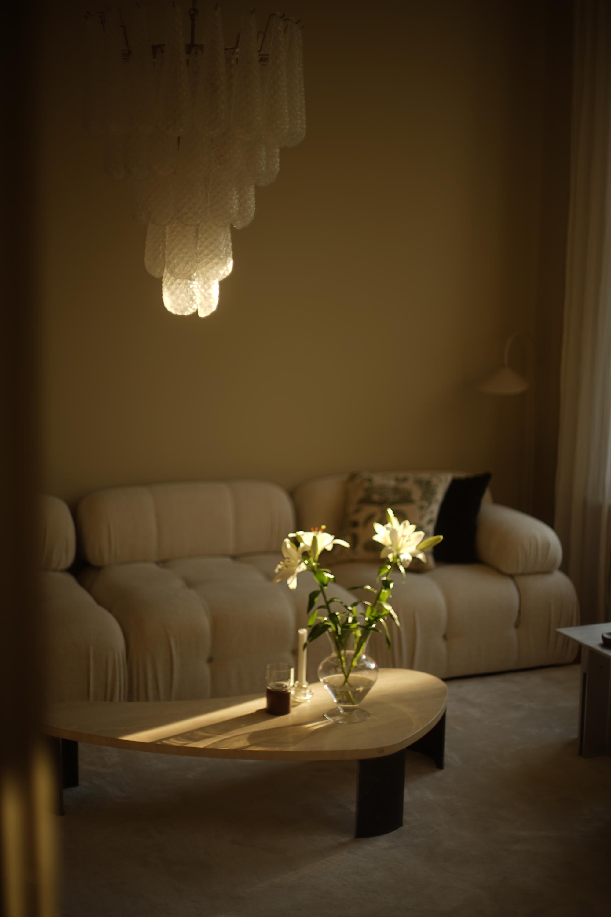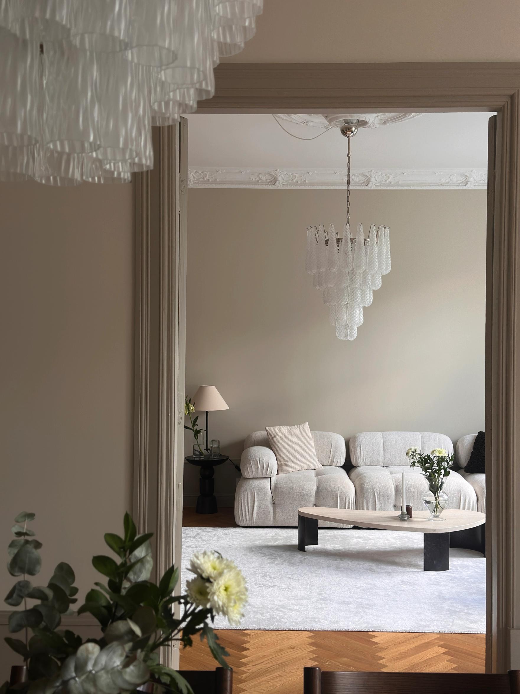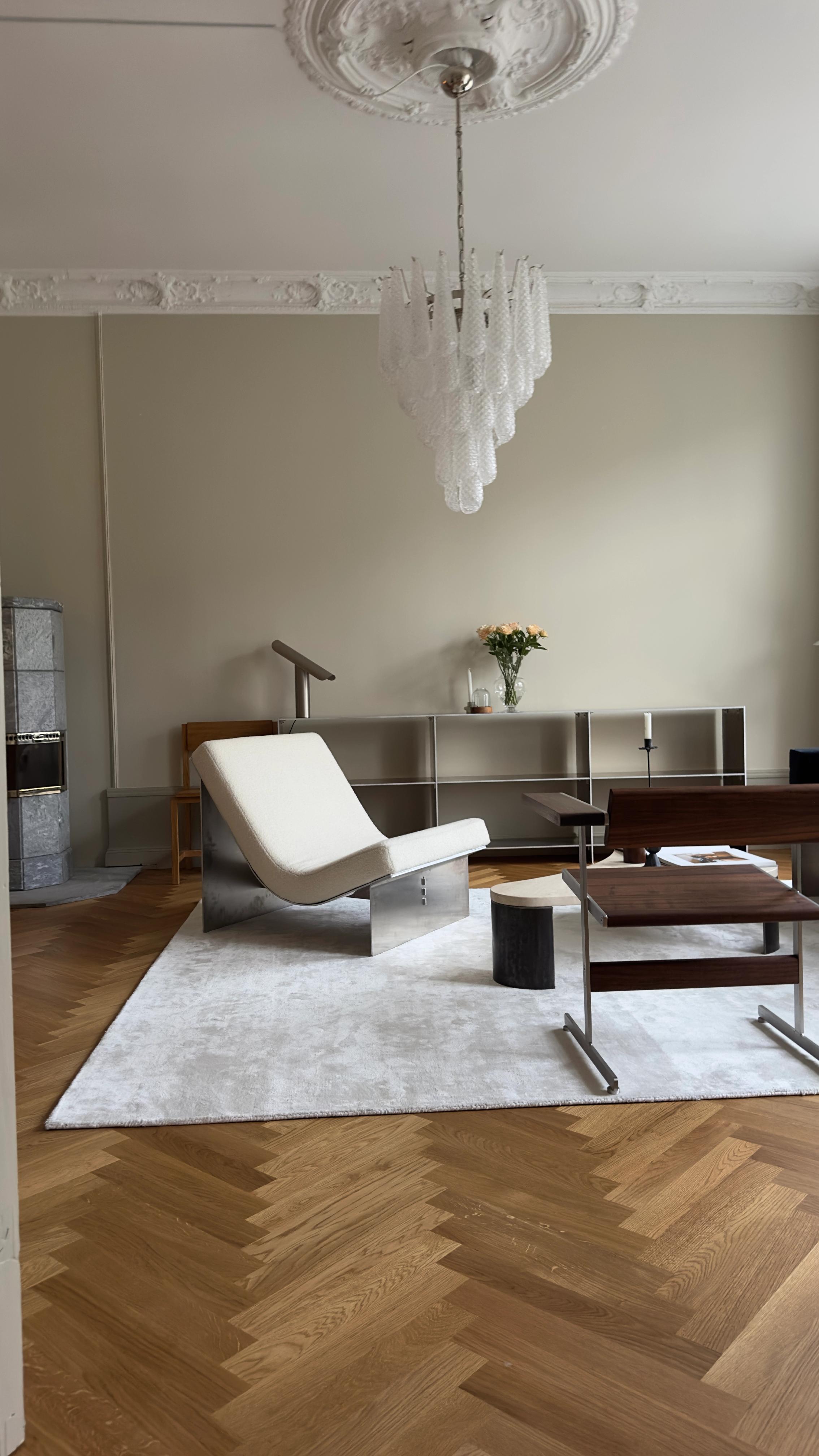 Lampen på bildene henger i showrommet vårt på St. Hanshaugen, og har klart (fargeløst) glass og ramme/armatur av polert nikkel (halvblank, sølvfarget finish). Dette er den fargekombinasjonen de fleste etterspør. Ønsker du andre farger på glass og/eller armatur, kan dette også bestilles. Send oss i så fall en e-post på shop@lunnheim.com.